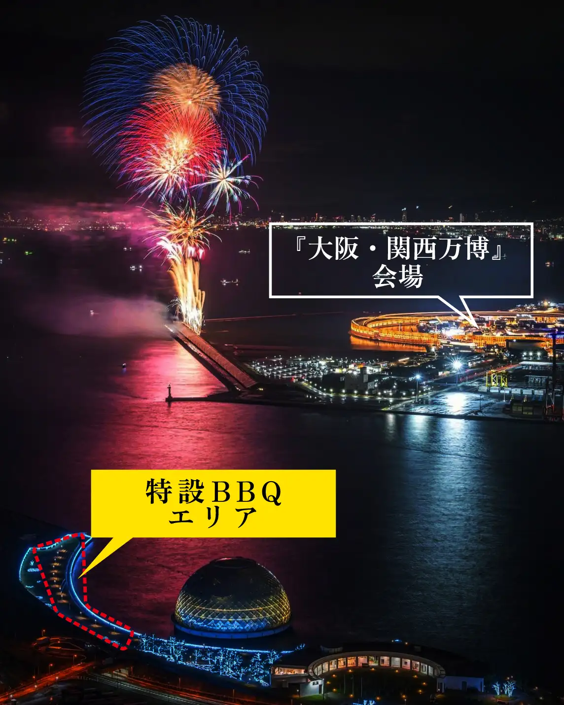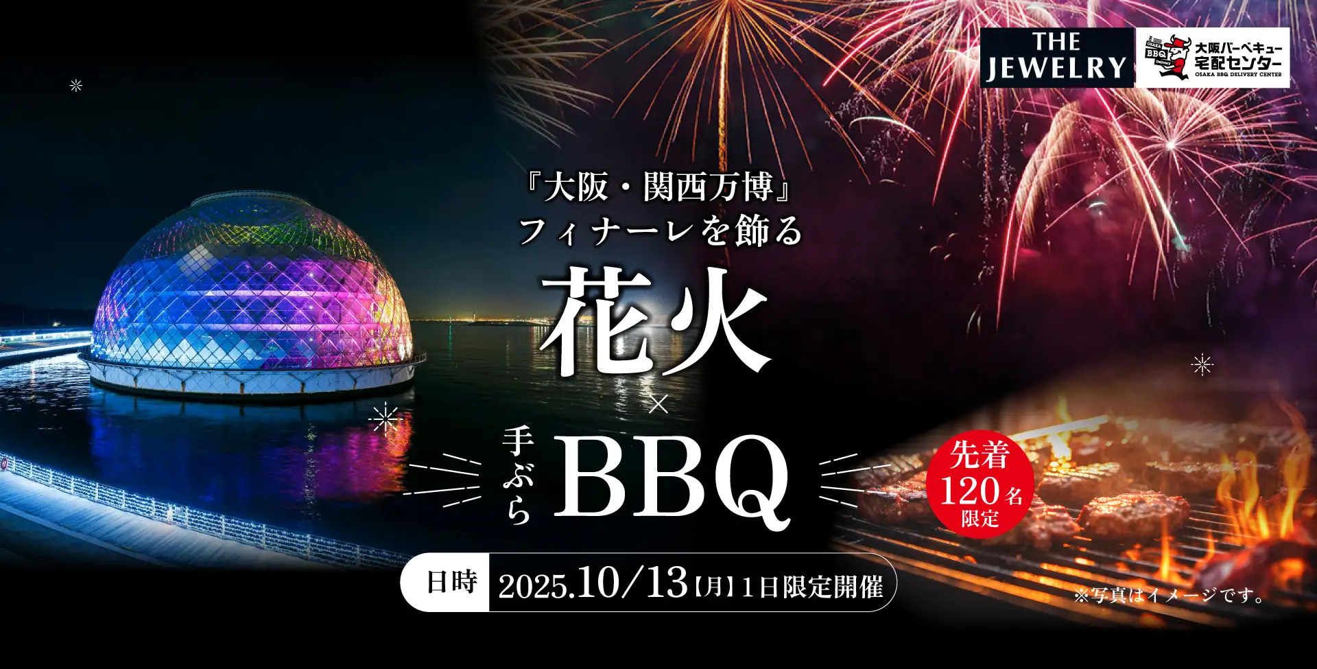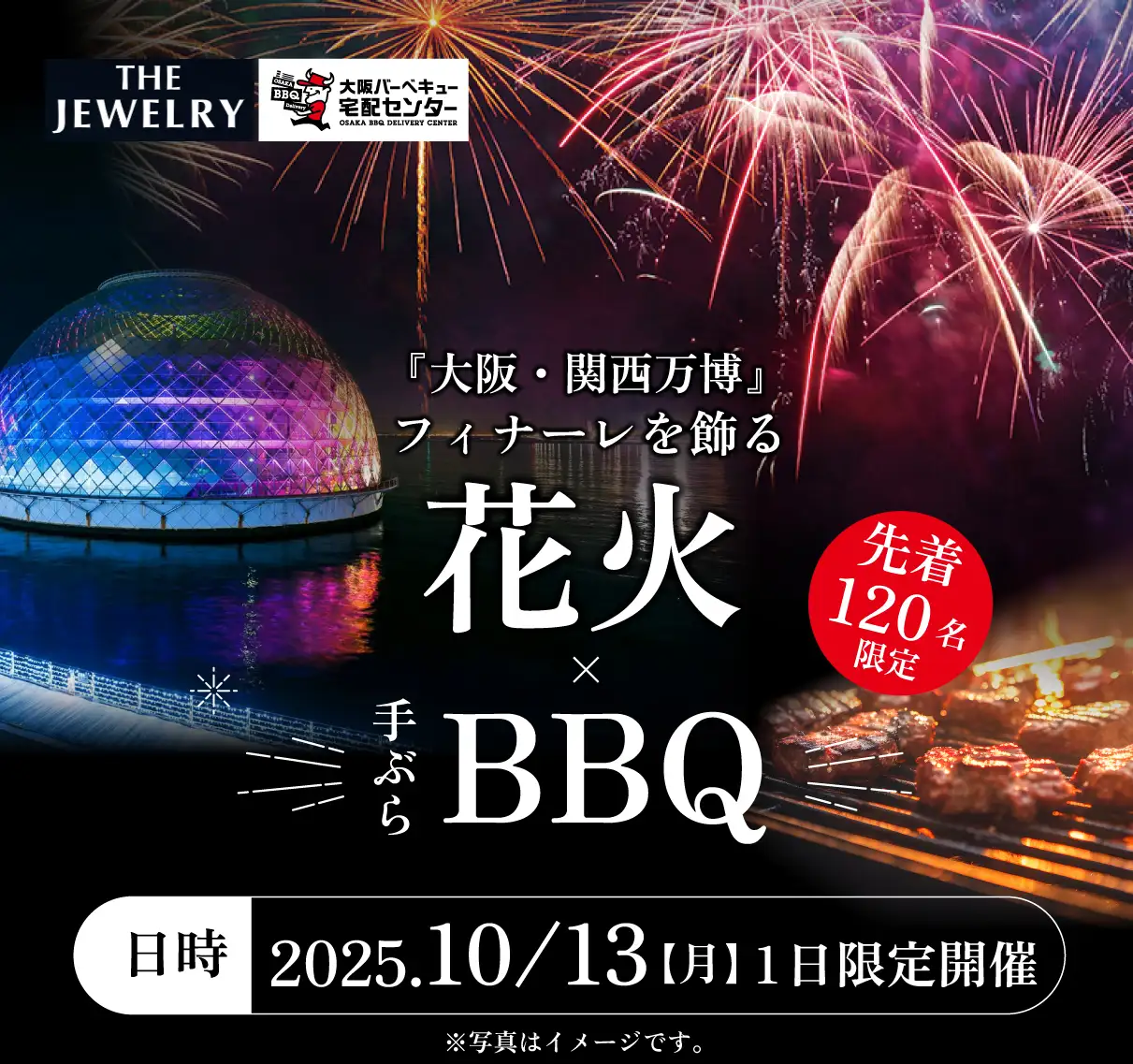 『THE JEWELRY』に1日限りの特設BBQ会場がOPENします。万博最後の花火をBBQをしながら特等席でお楽しみいただけます。