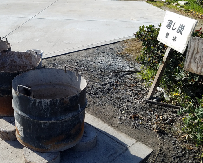 有料期間中は写真の消し炭置き場横にゴミ捨て場が設置されます。しっかりと分別処理されるので、バーベキュー後のゴミの分別にご協力下さい。