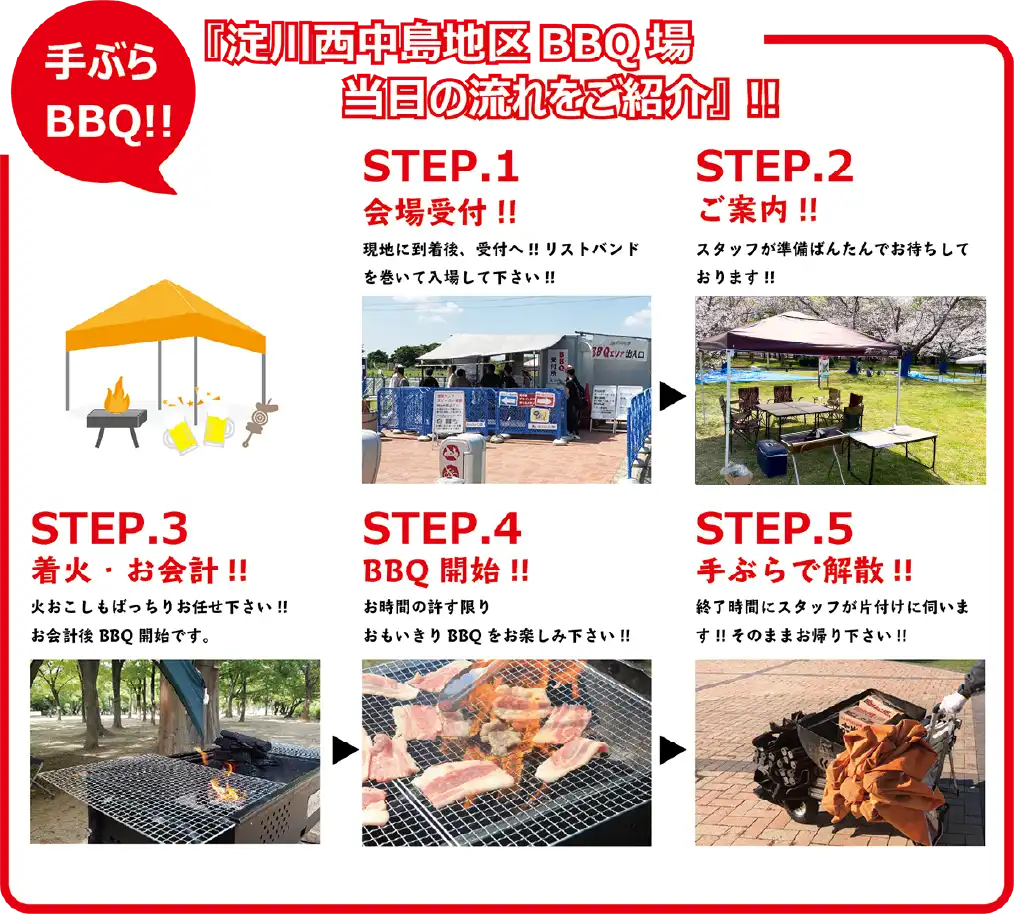※現地・淀川河川公園西中島地区のBBQエリア内に売店や自動販売機等はありませんのでご注意下さい。【アクセス方法など、会場詳細はこちら!!】