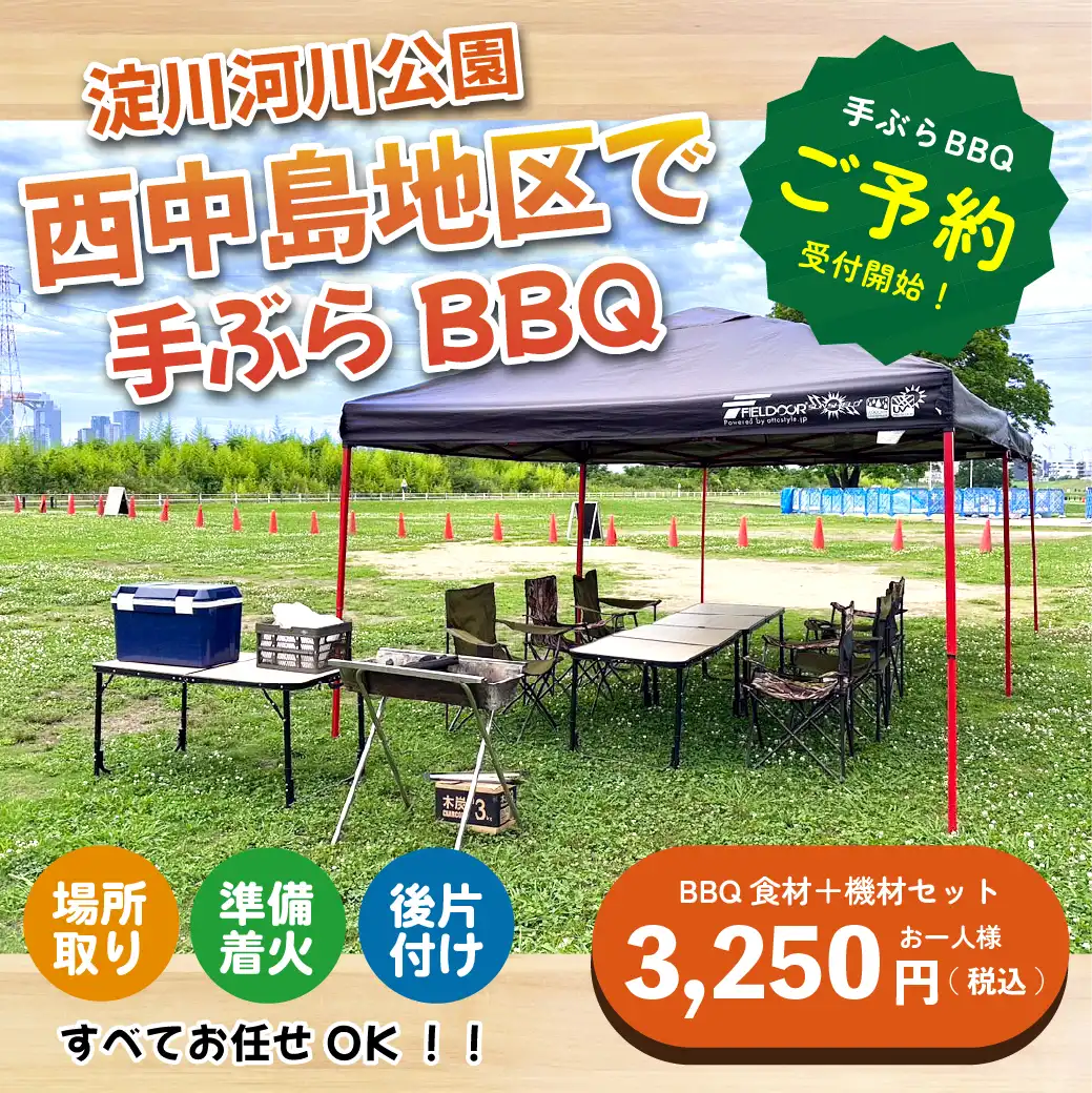 淀川河川公園西中島地区は大阪人気No.1のBBQスポットです。梅田から10分程度でアクセスでき都心からのアクセスが抜群です。 季節によっては有料ですが利便性に優れたおすすめバーベキュースポットになります。西中島地区の他にも、淀川沿いにはBBQ可能なエリアがたくさんございます!!