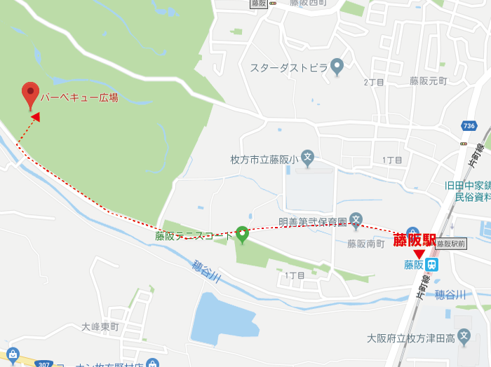 JR片町線藤阪駅が最寄駅になります。バーベキューエリアまでは、徒歩で16分の距離になります。途中、ローソンなどコンビ二はありますが、スーパーマーケットなどは遠いので現地での買出しには不向きです。
