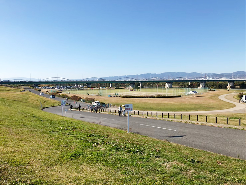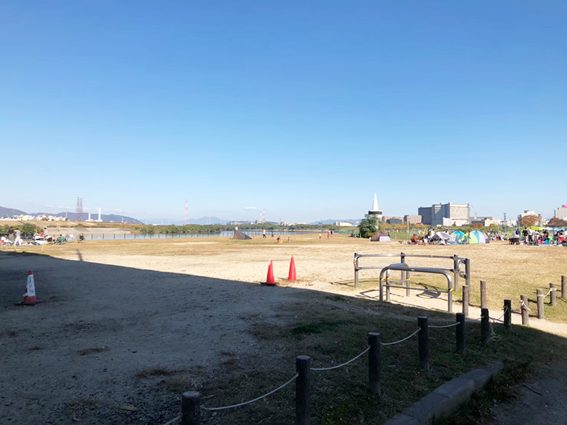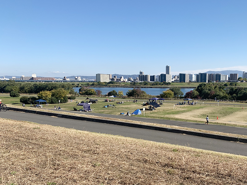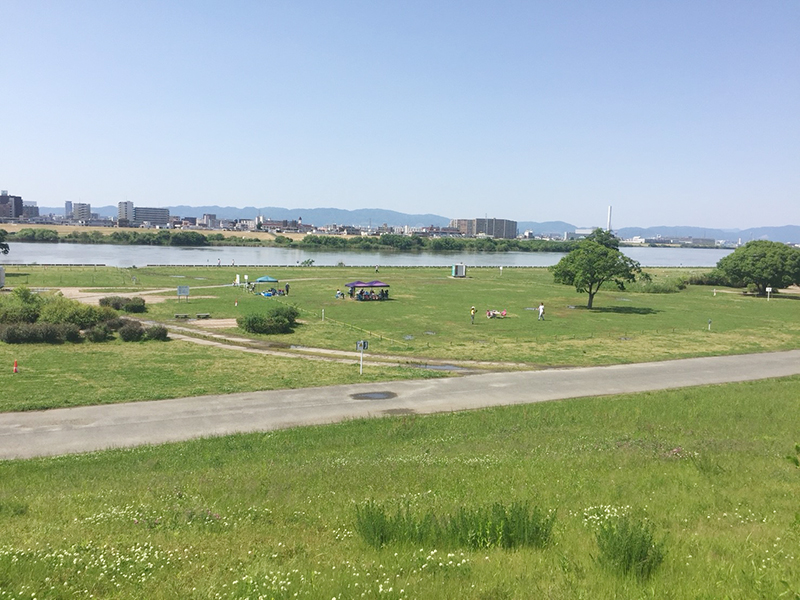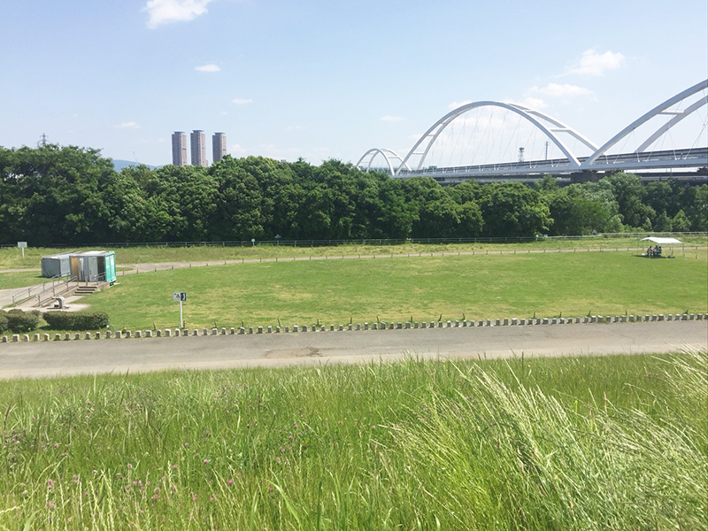 枚方大橋の高槻市側のバーベキュー可能エリアです。対岸の枚方地区と比べ比較的ゆったりバーベキューをすることができます。